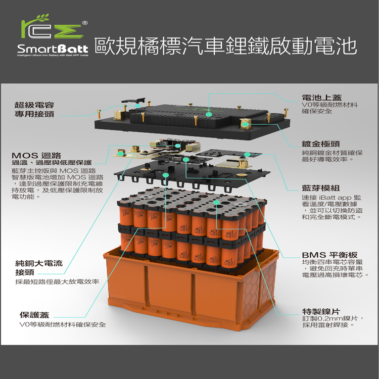 RCE 智慧鋰鐵電池是全球第一款結合手機 App(iBatt)與主動式電源管理系統的啟動電池,主打高性能、節能減碳與使用便利性。使用者透過藍牙連接手機 App,就能即時監控電池狀況並操作多種功能,如防盜斷電、緊急啟動、電池保護等。